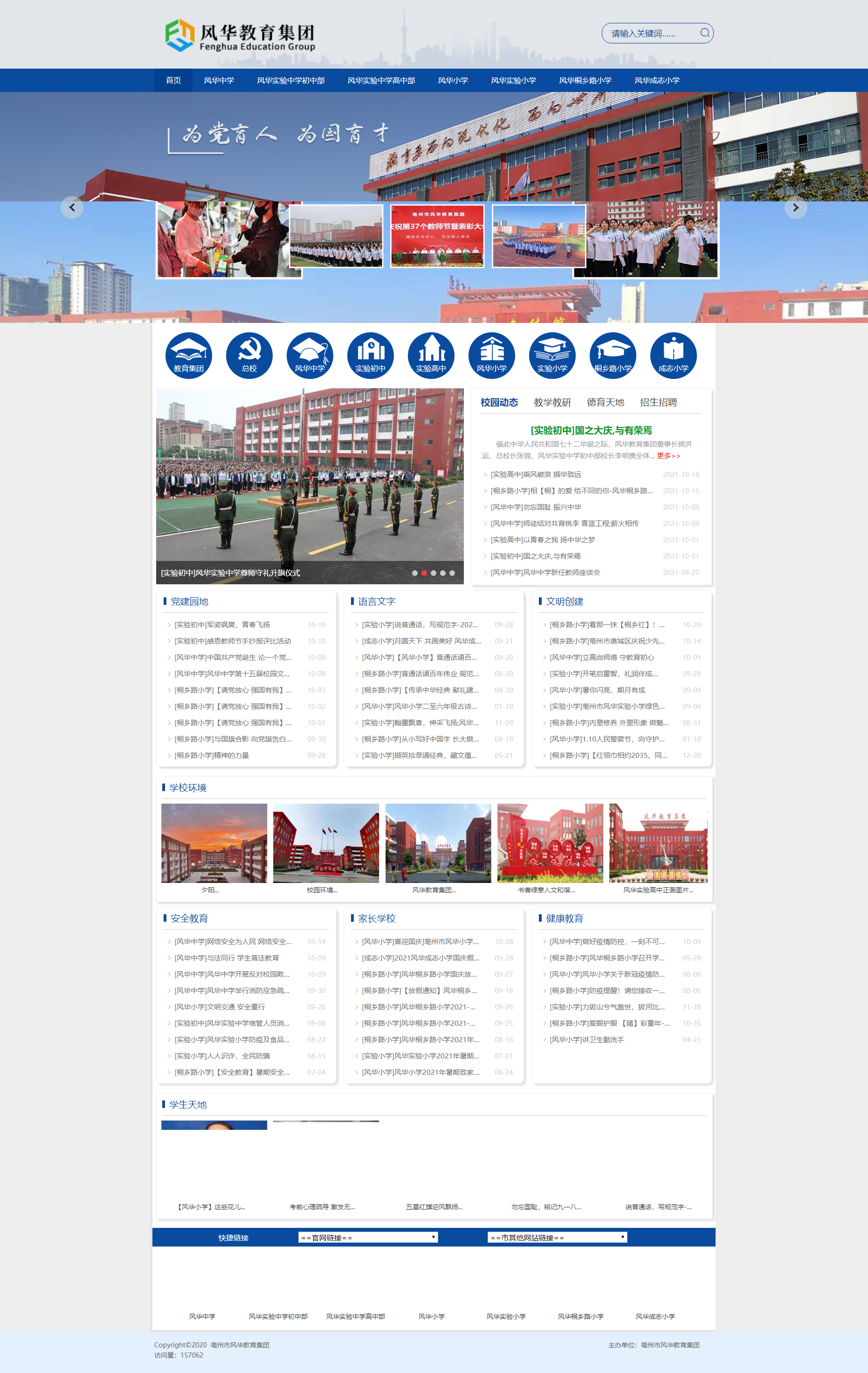 風(fēng)華中學(xué)自2008年第一次中考以來(lái),連續(xù)13年中考成績(jī)綜合排名亳州市第一名,每年都有90%以上的學(xué)生考取省級(jí)示范高中。贏得了“管理嚴(yán)、質(zhì)量高、教風(fēng)正、學(xué)風(fēng)濃”的贊譽(yù)。先后被國(guó)家部委,省市縣區(qū)等部門命名為“中國(guó)西部教育顧問(wèn)單位”、“江蘇省英語(yǔ)學(xué)科建設(shè)和實(shí)踐基地”、“安徽省地方稅收教育基地”、“安徽省科技創(chuàng)新試點(diǎn)學(xué)校”、“亳州市高校畢業(yè)生就業(yè)見(jiàn)習(xí)基地”;先后榮獲“亳州市民辦非企業(yè)先進(jìn)單位”、“亳州市安全綜合治理工作先進(jìn)單位”、“亳州市安全文明校園”、“安徽省民辦學(xué)校先進(jìn)單位”、“安徽省人民防空先進(jìn)單位”、“全國(guó)民辦學(xué)校先進(jìn)單位”、“中國(guó)民辦教育百?gòu)?qiáng)”、“亳州市‘雙比雙爭(zhēng)’先進(jìn)社會(huì)組織黨組織”、“亳州市五星基層黨組織”等榮譽(yù)稱號(hào)。